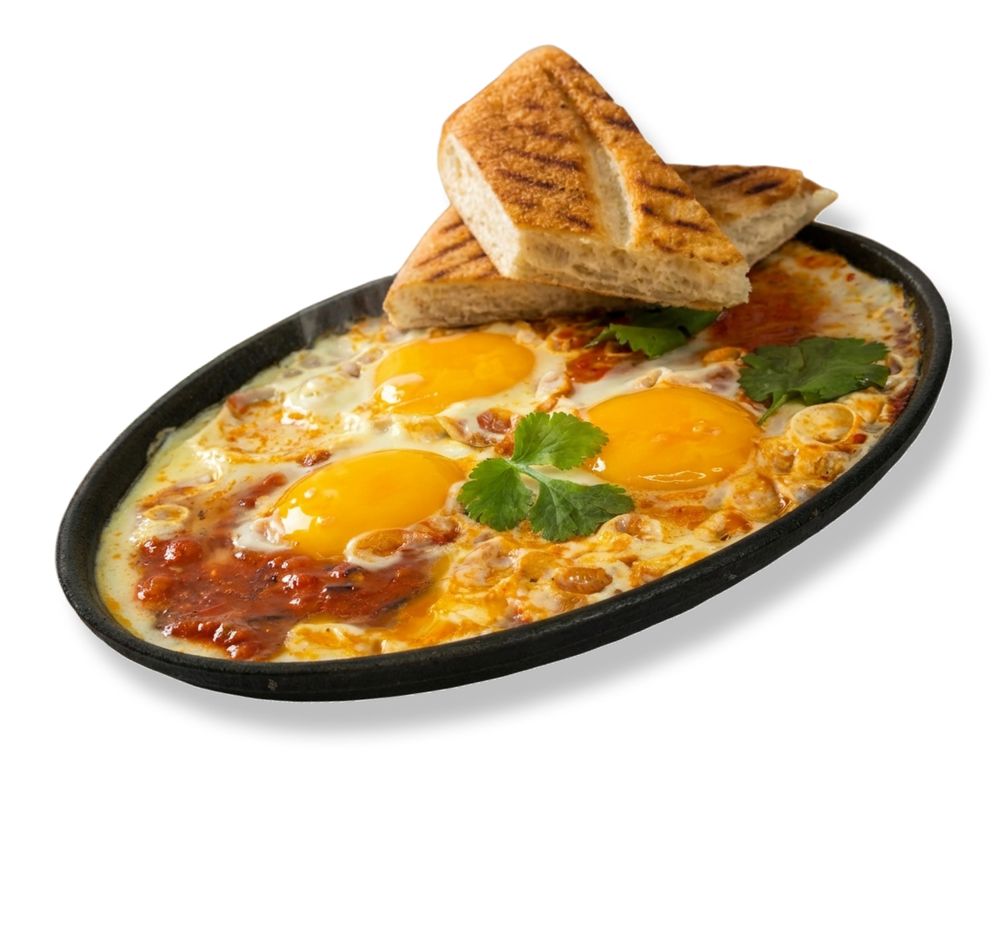 Яйцо куриное, перец болгарский, лук репчатый, соус томатный, чеснок, кинза, тост из лаваша