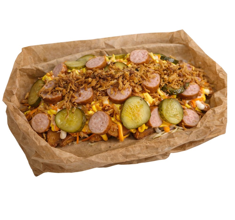 картофельные дольки, колбаска куриная, огурец маринованный, салат Коул слоу, соус ранч, соус сырный, соус бургер, лук фри