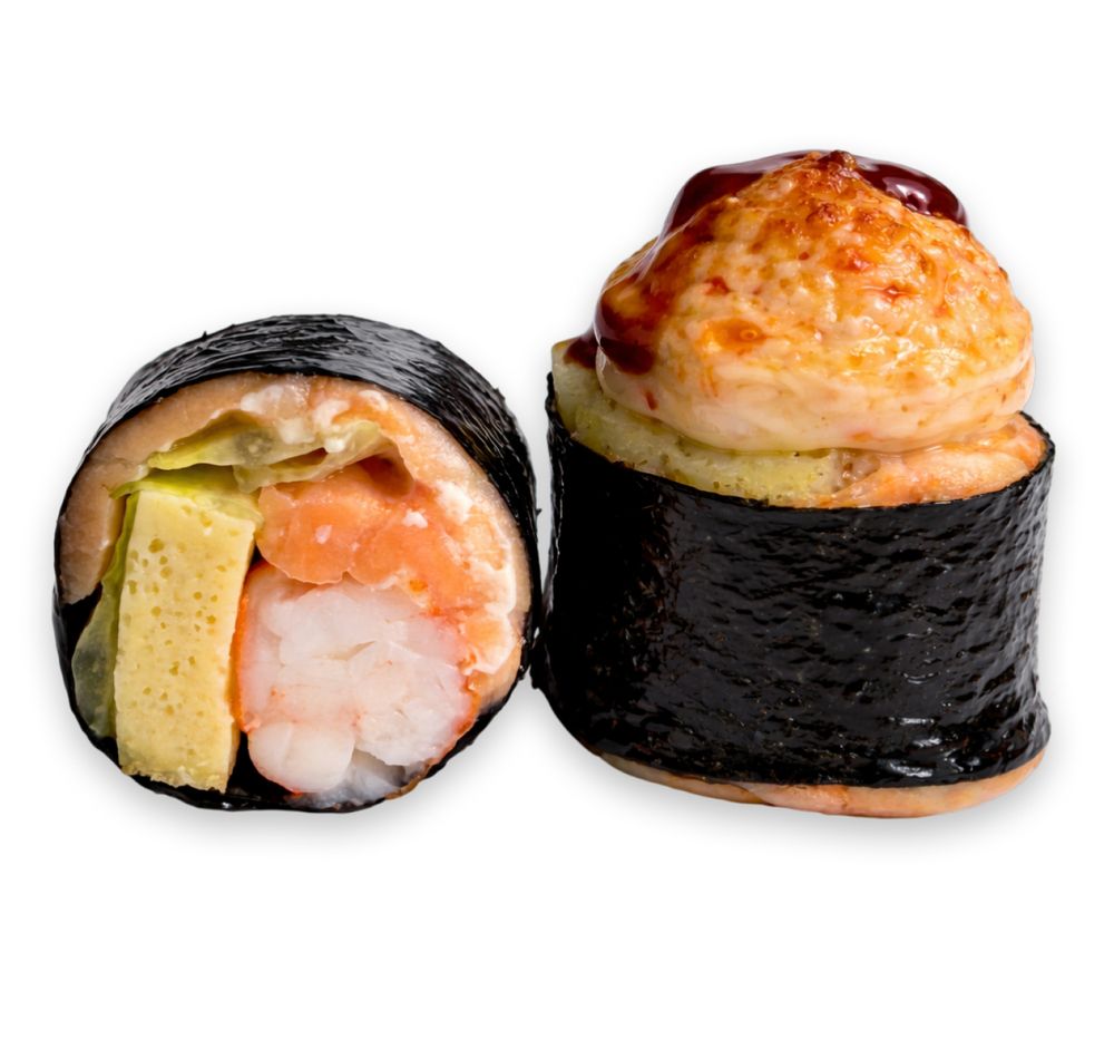 лосось, креветка тигровая, омлет японский, салат айсберг, соус мотояки, соус унаги