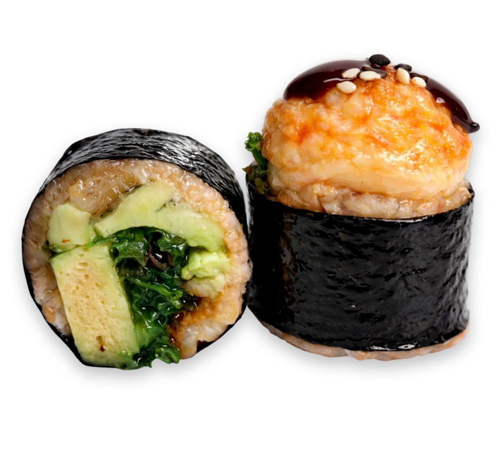 лосось, угорь копченый, омлет японский, водоросли чука, соус мотовки, соус унаги, кунжут