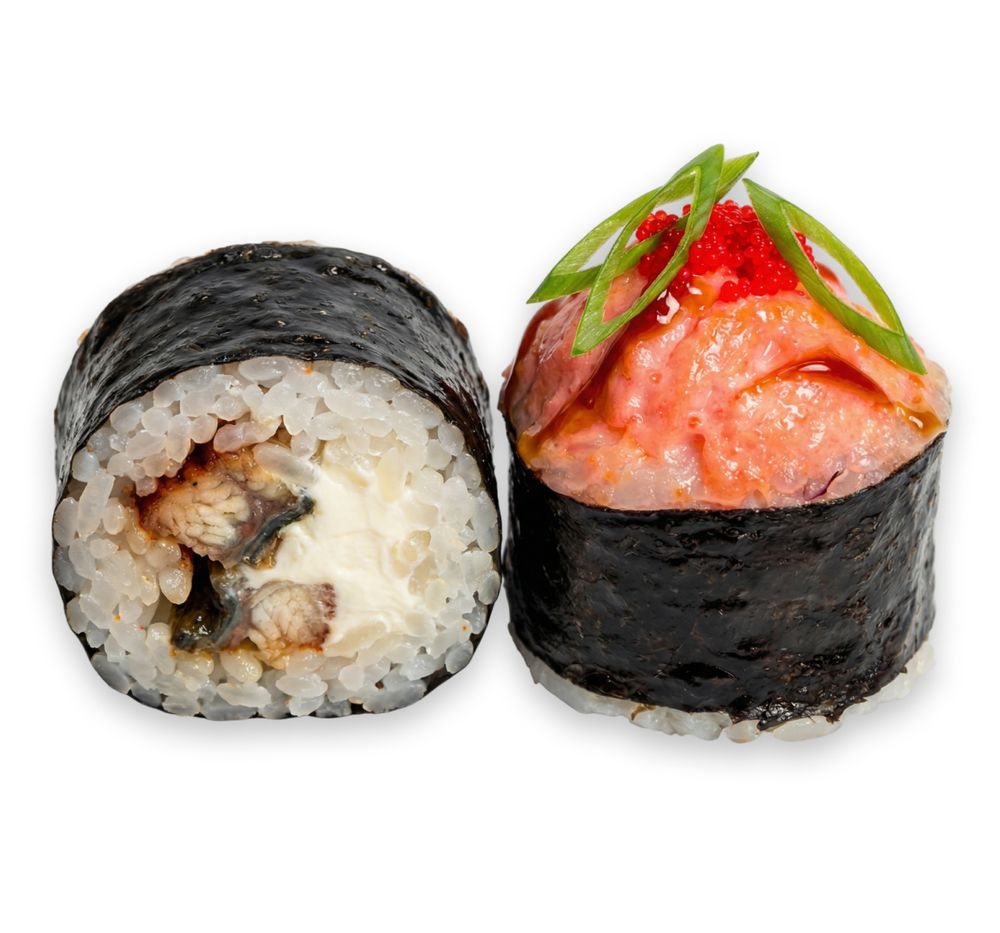 угорь копченый, сыр сливочный, соус мотояки, лосось, масаго красная, соус унаги, лук зеленый