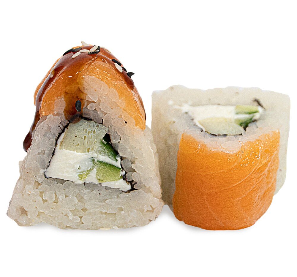 лосось копченый, сыр сливочный, огурец, японский омлет, унаги соус, кунжут