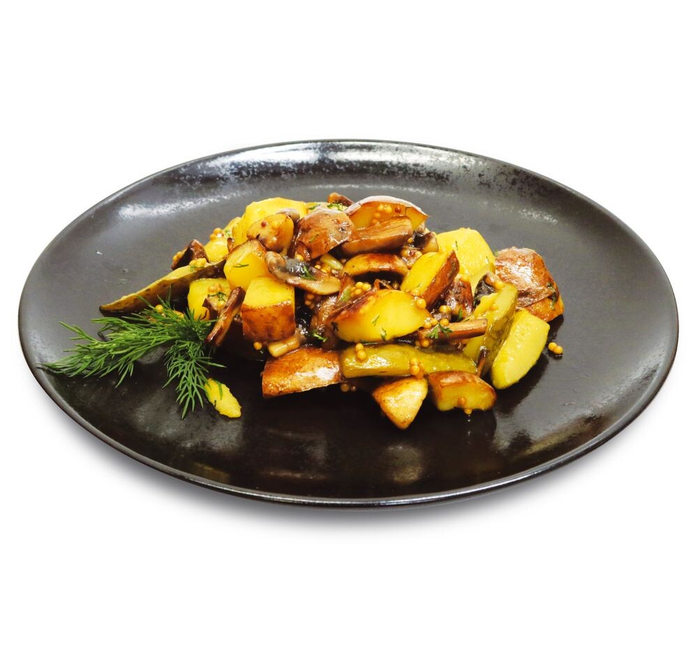 картофель, грибы шампиньоны, огурец соленый, горчица зернистая, мед, зелень