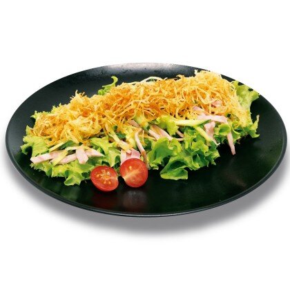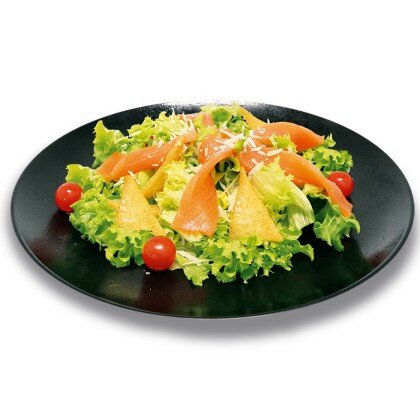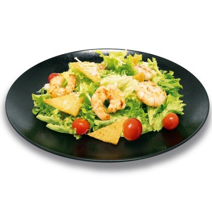 Обжаренная куриная грудка, лист салата, салат Айсберг, помидоры черри, сухарики, сыр Пармезан, соус Цезарь
