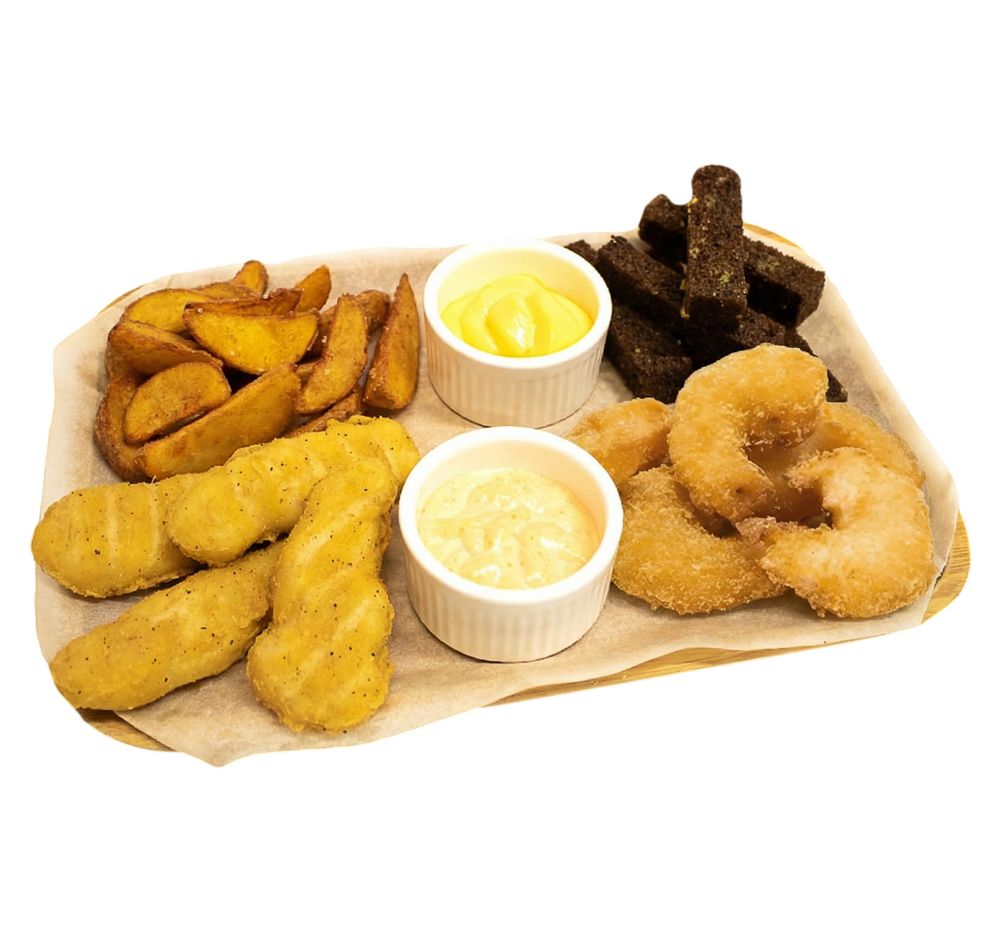 Картофельные дольки со специей, креветки попкорн, гренки чесночные ржаные, стрипсы куриные, соус спайси, соус сырный